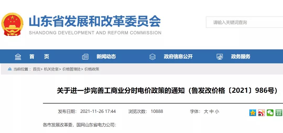 2022年1月1日起執(zhí)行!山東印發(fā)關(guān)于進(jìn)一步完善工商業(yè)分時(shí)電價(jià)政策的通知