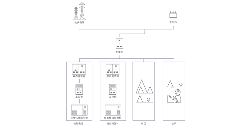根據(jù)礦企的用電特性區(qū)分負荷種類,對重要負荷進行配電改造,提供磷酸鐵鋰儲能系統(tǒng)”保安電源解決方案,實現(xiàn)大功率高倍率放電,在突然斷電等應(yīng)急場合安全使用,確保重要負荷的正常工作。